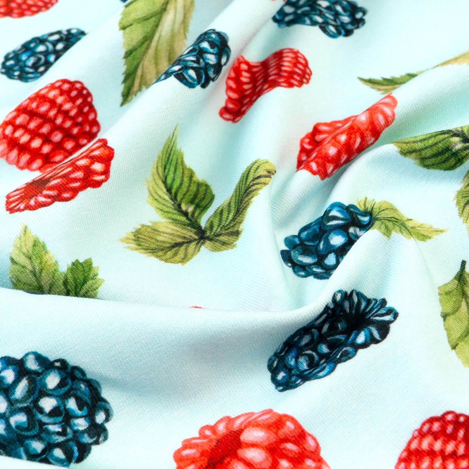 Weicher & elastischer Baumwolljersey bedruckt mit Himbeeren und Brombeeren Geeignet z.B. für Longsleeves, T-Shirts, Kleider & Leggins.