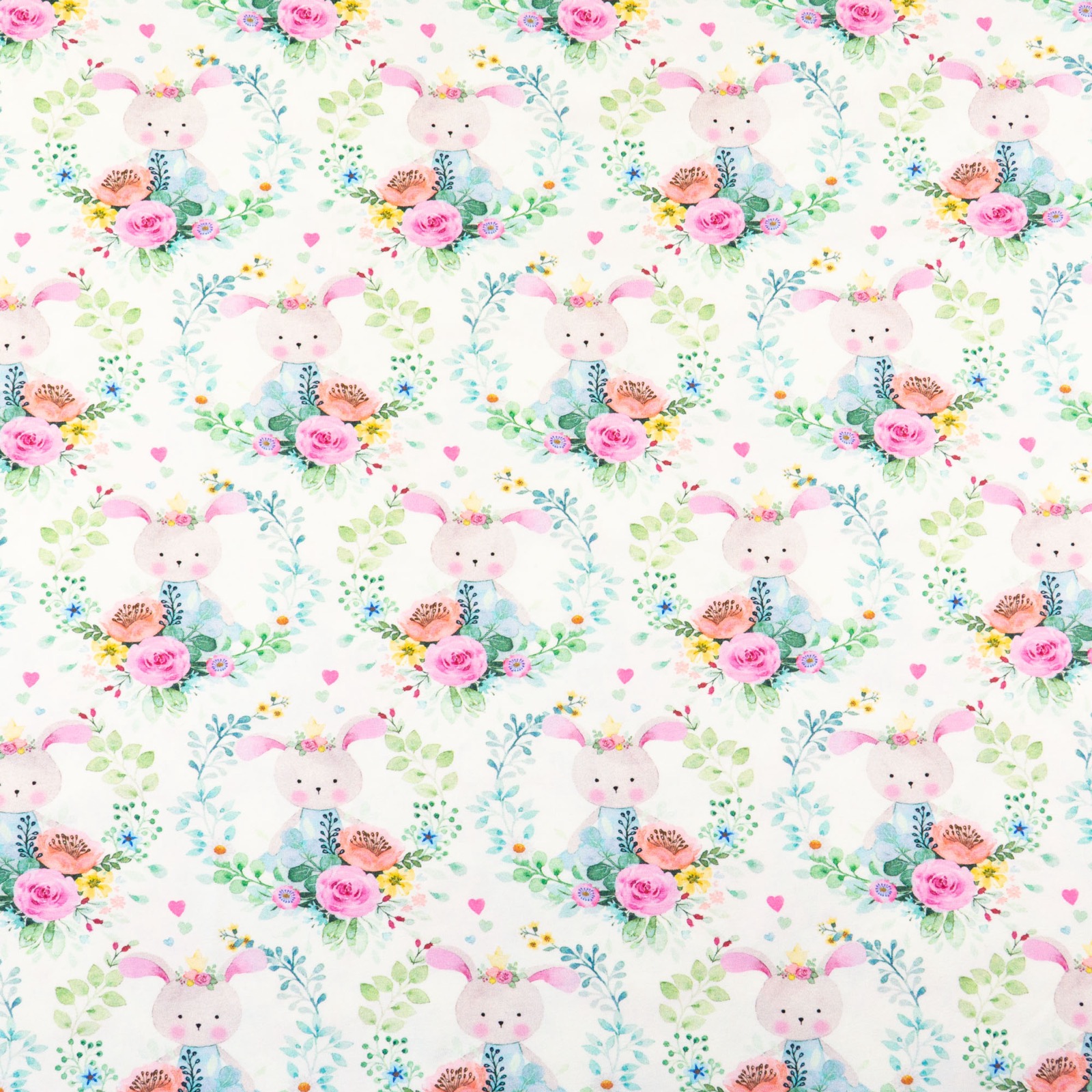 Weicher und elastischer Jersey aus Baumwolle bedruckt mit kindlichen Häschen und floralen Elementen. Geeignet z.B. für Shirts, Longsleeves, Kleider, Leggins sowie Accessoires für Erwachsene und Kinder.