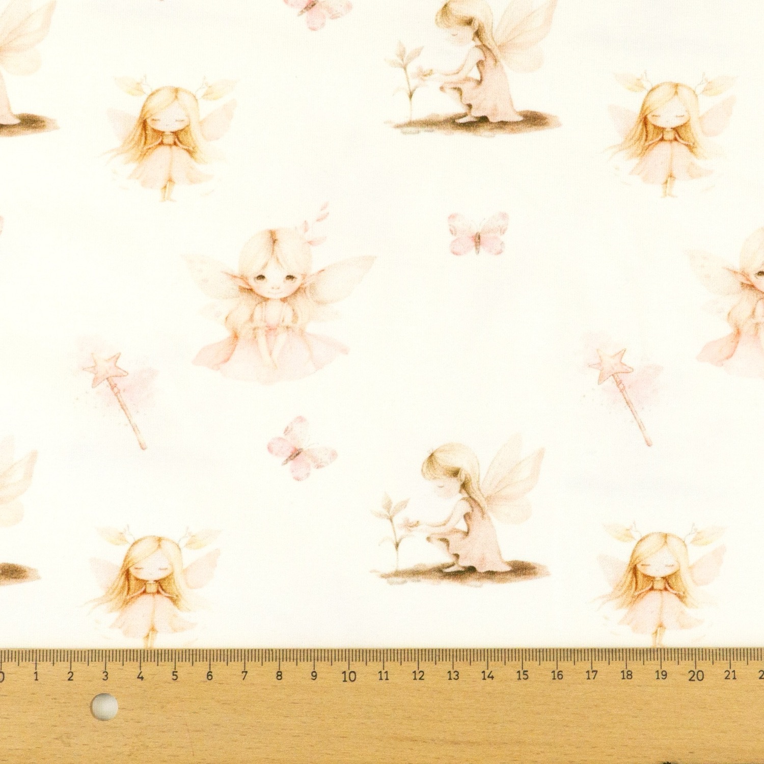 Elastischer und weicher Baumwolljersey bedruckt mit Feen Motiven. Geeignet z.B. für T-Shirts, Longsleeves, Leggins und Kleidchen.