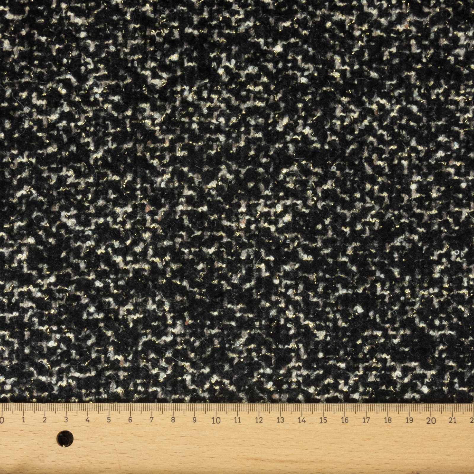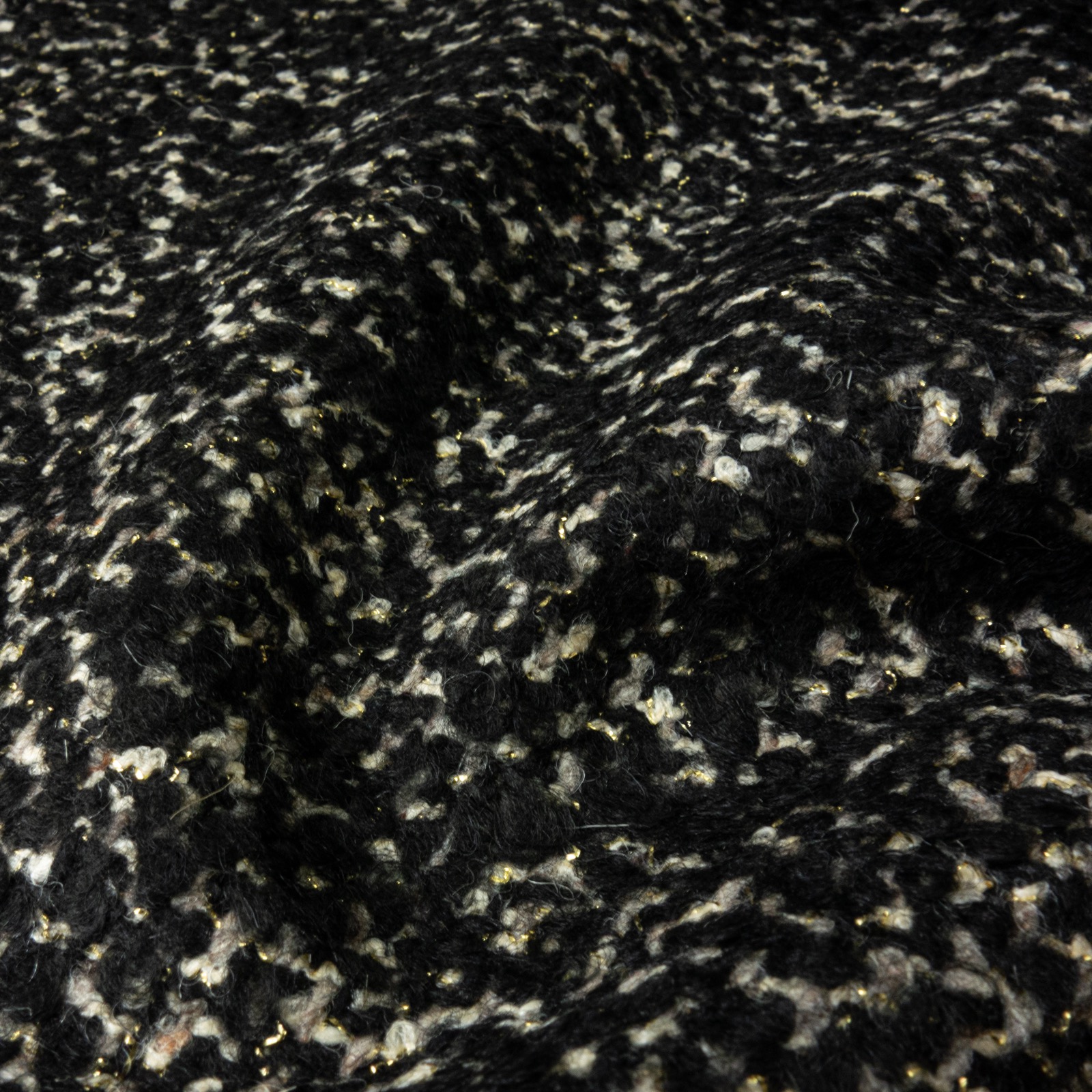 Kompaktes Buntgewebe mit Alpakahaaranteil und aus verschiedenen Effektgarnen sowie verwebtem goldenem Glanzgarn. Geeignet z.B. Jacken und Mäntel.