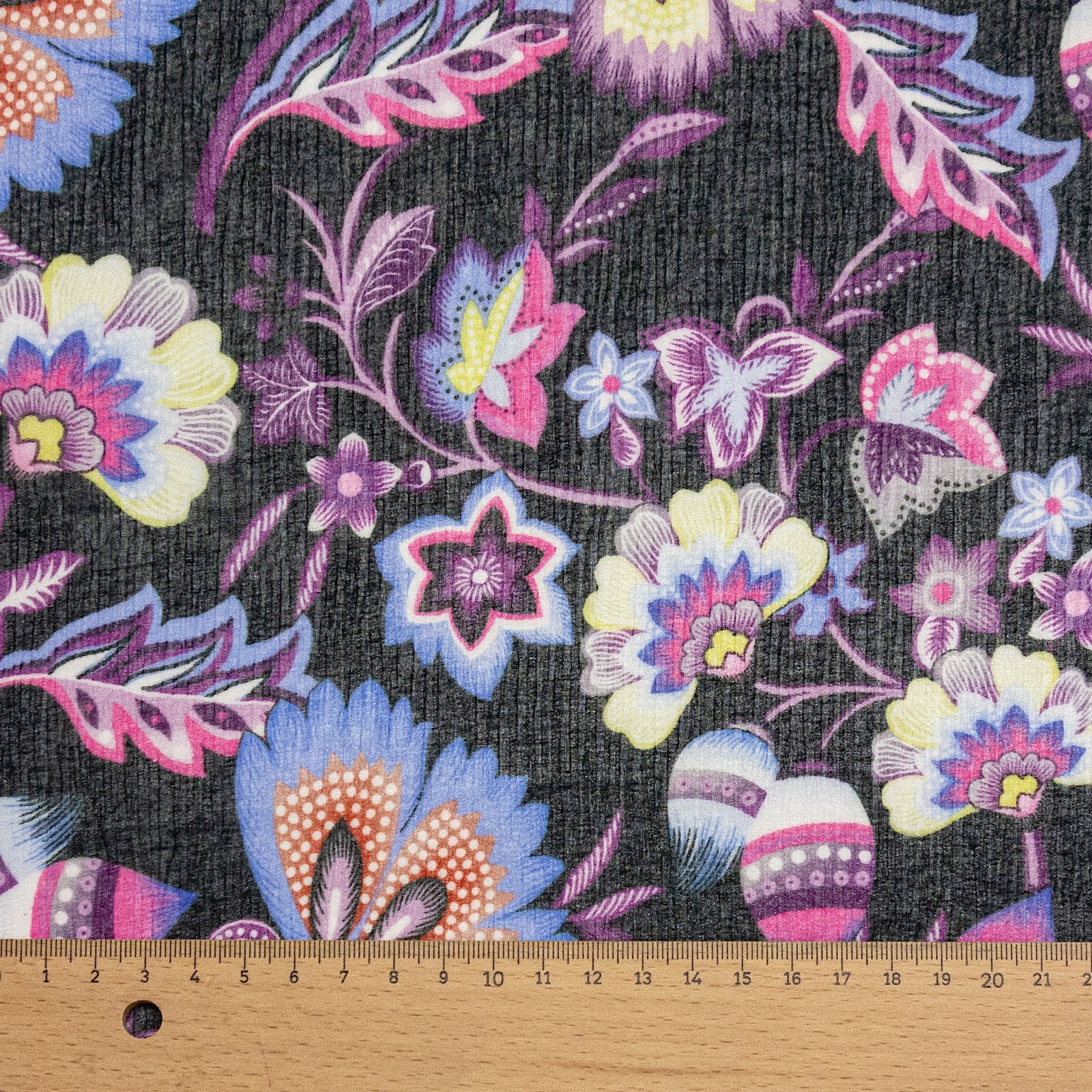 Italienischer, leicht gecrashter Crêpe-Chiffon aus Seide und Baumwolle, bedruckt mit kontrastreichen Paisley-Blüten.