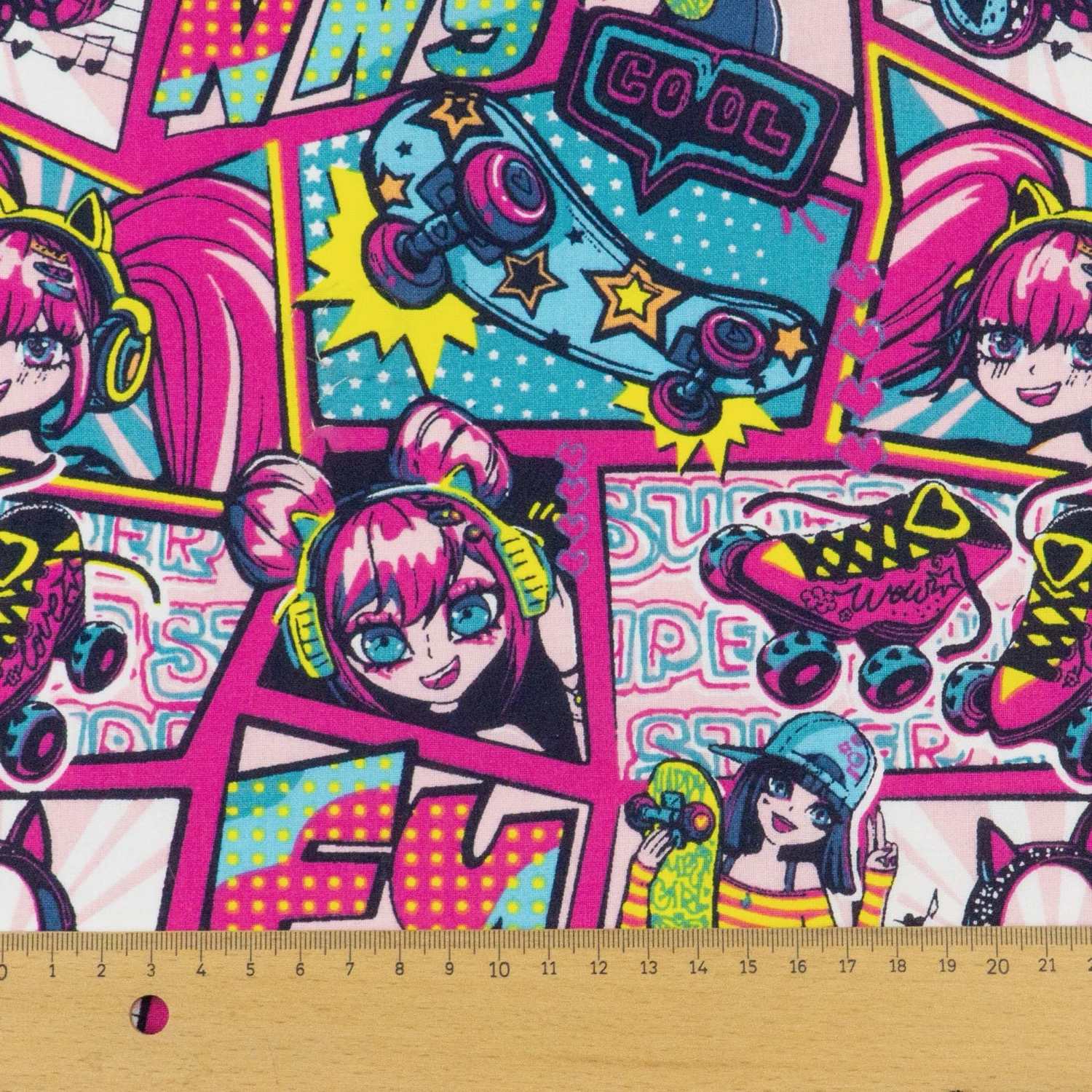 Leichtes Baumwollgewebe bedruckt mit farbenfrohen Anime Motiven. Geeignet z.B. für Bekleidung, Kosmetiktaschen, Bettwäsche und Patchwork.