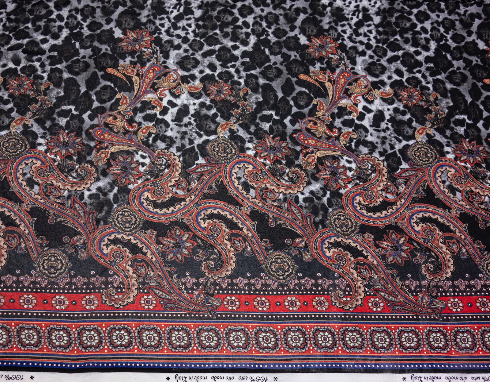 Elastischer Seiden-Crêpe aus Italien mit klassischem Leo Print und Bordüre im Fadenlauf, entlang des rechten Stoffrandes (Webkante).