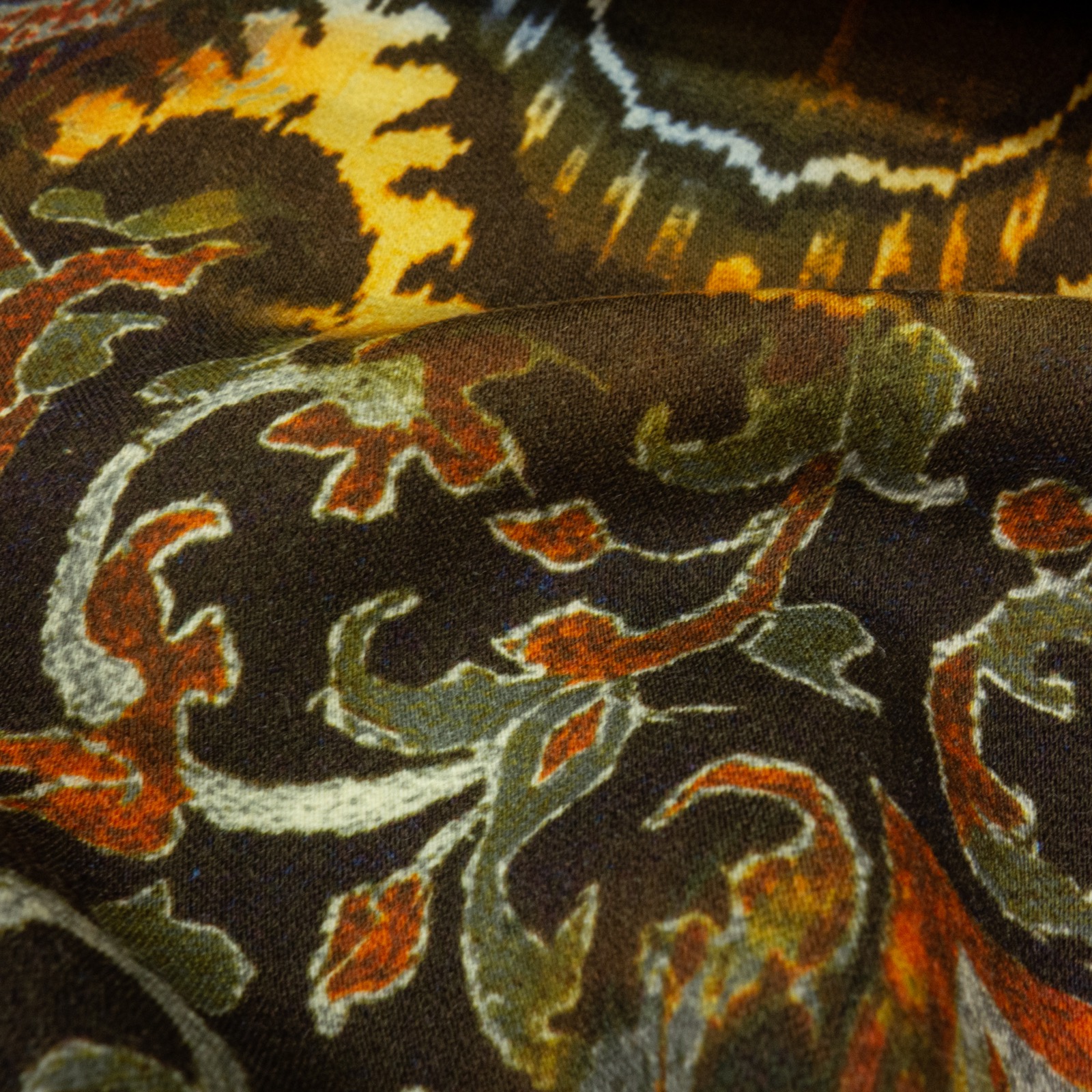 Weicher Wollcrêpe mit schwerem Fall und Ethno-Print. Geeignet z.B. für Kleider und Röcke.