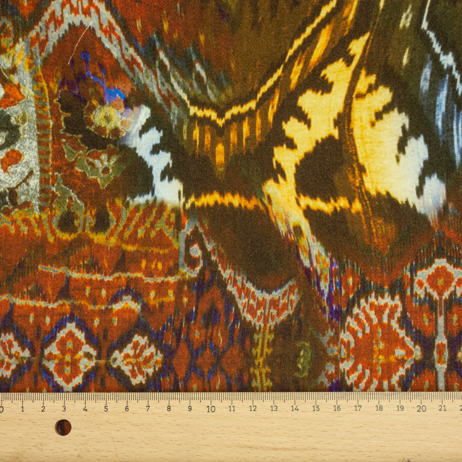 Wollstoff, Crêpe, brauntöne, gelb, royalblau, Ethno-Muster