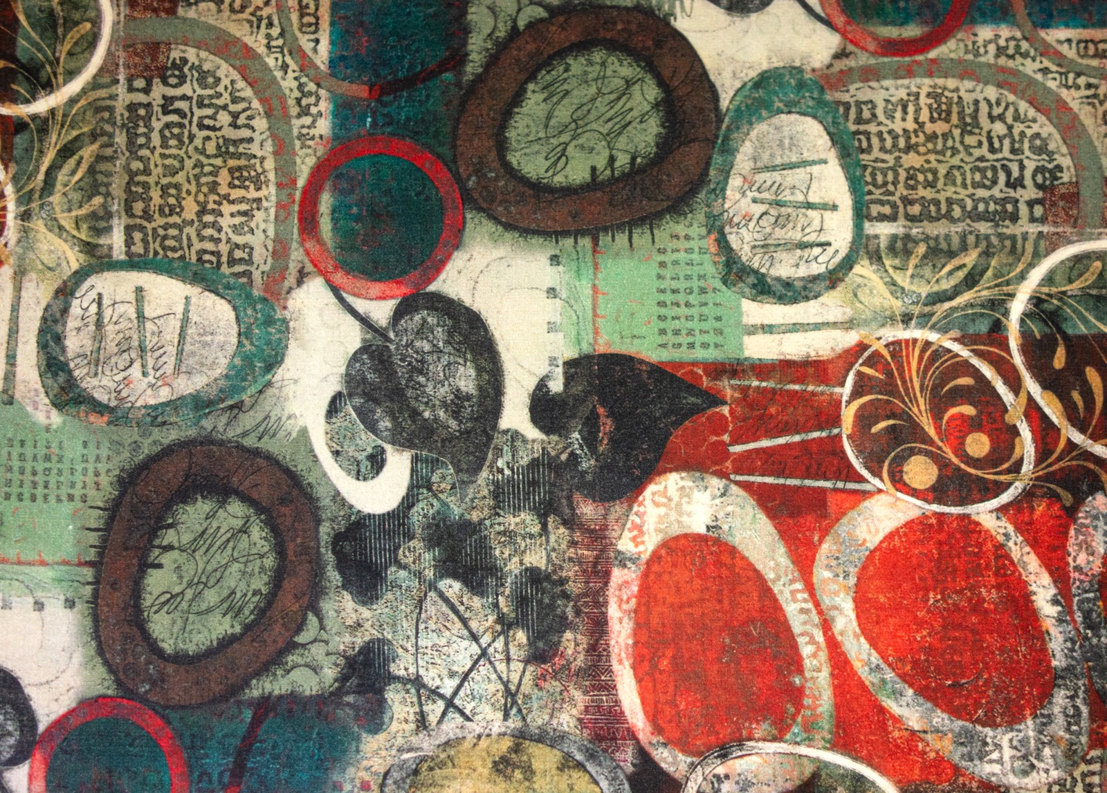 Wollstoff, Crêpe, grautöne, beige, grün, rot, florale Motive, Typographie