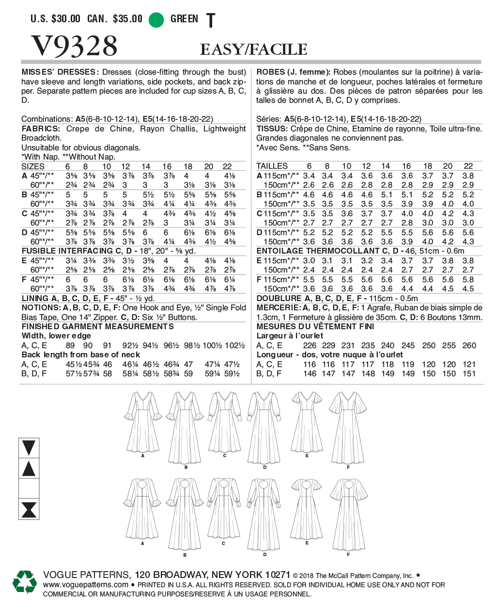 Einzelschnittmuster von VOGUE Patterns mit Mehrgrößenschnitt in Originalgröße auf Papierbögen zum Auskopieren oder Ausschneiden.