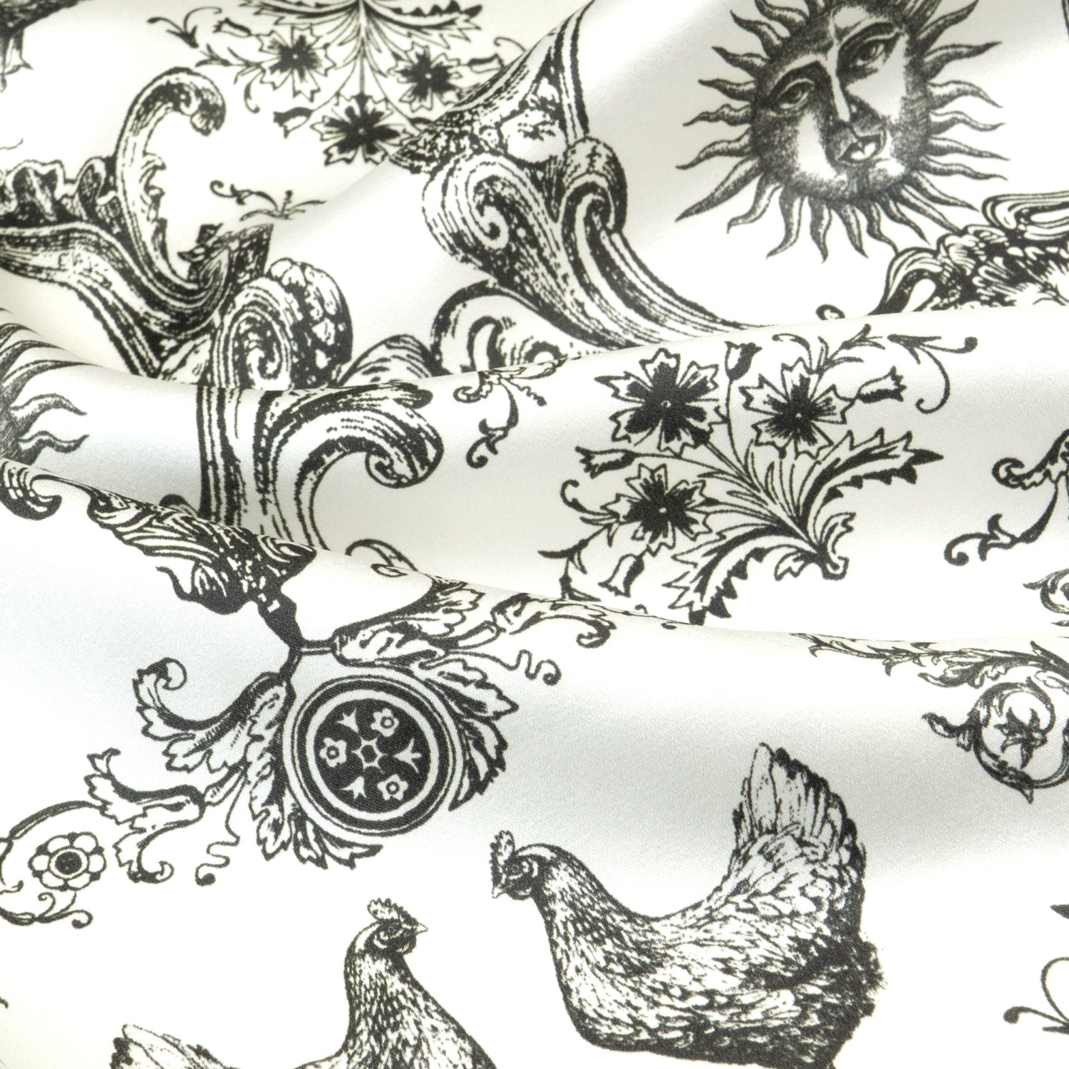 Elastischer Seidensatin mit edlem Glanz und ornamentalem Muster inklusive Sonnen und Huhn Motiven. Geeignet z.B. für Hemden, Blusen, Kleider und Tücher.