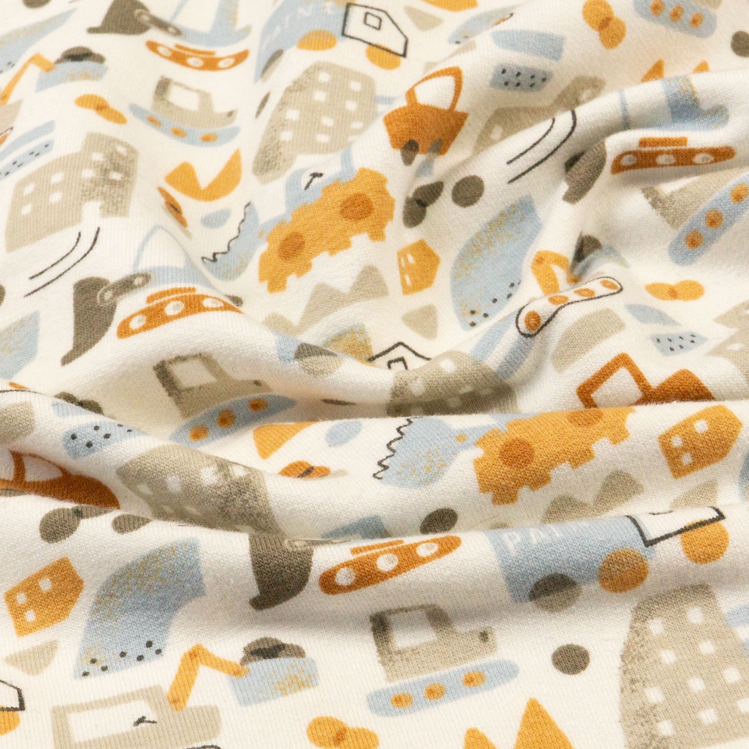French Terry, offwhite, pastellblau, hellbraun, Kindermotive – Fahrzeuge
