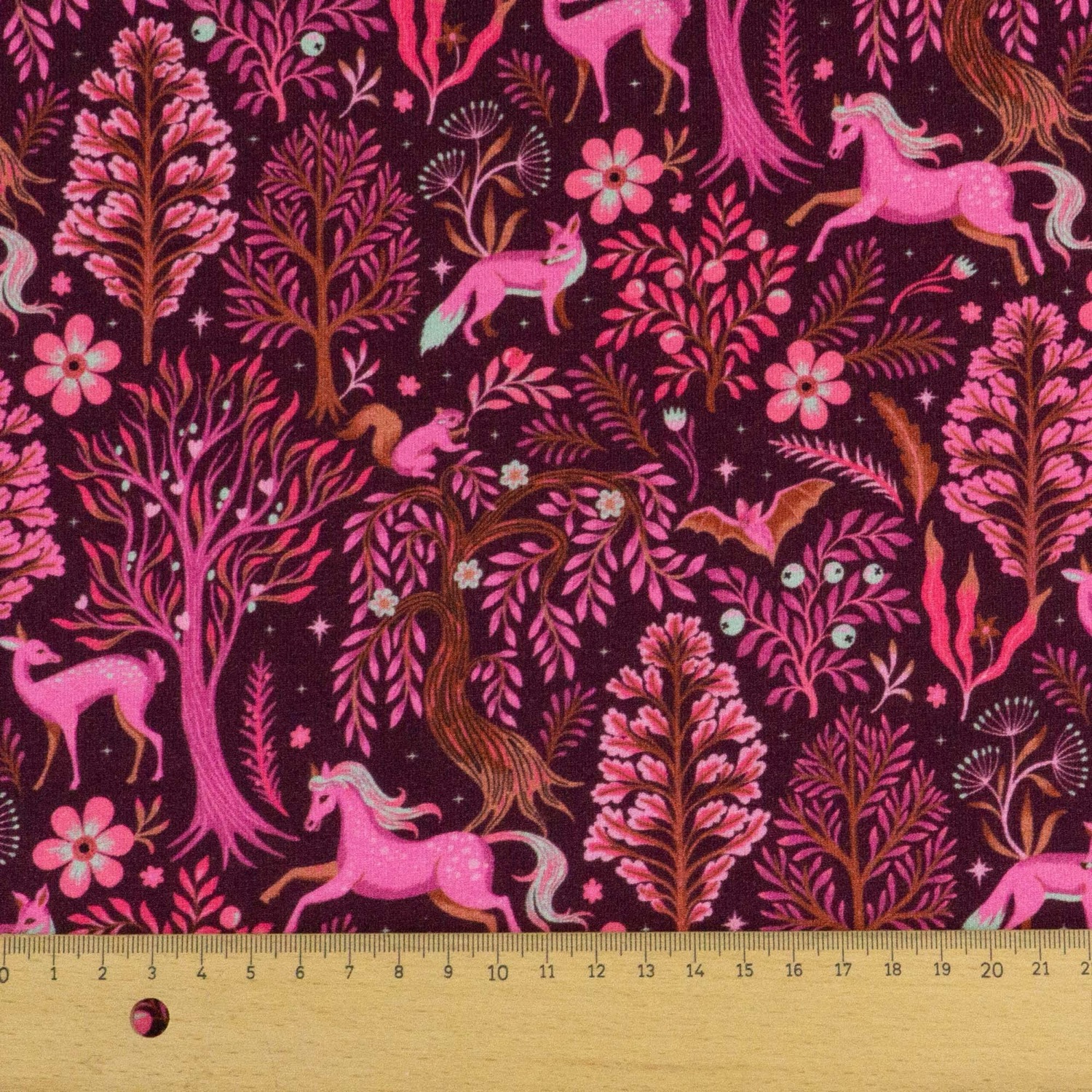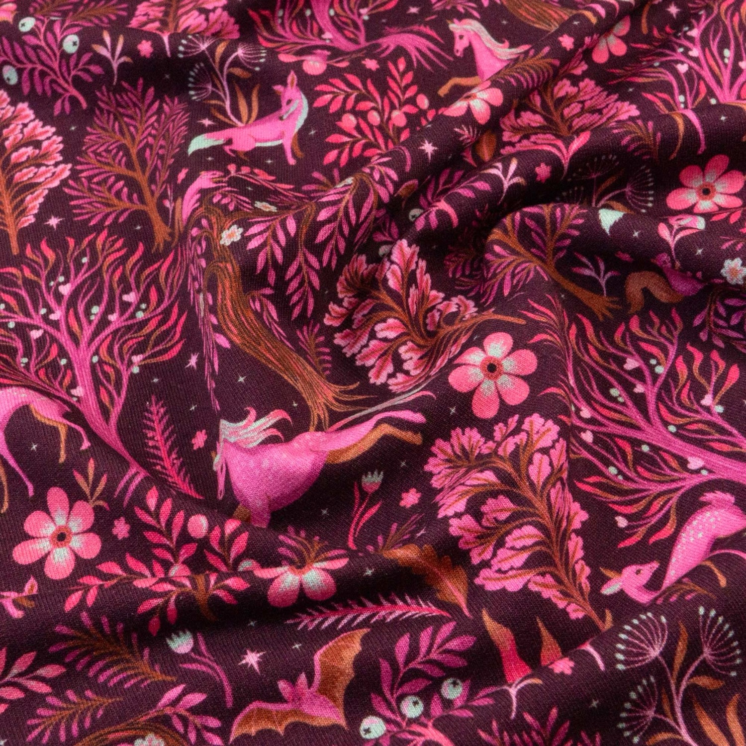 Elastischer French Terry in Rosatönen mit einem Print aus Tiermotiven wie Pferd, Fuch, Fledermaus und Reh. Geeignet z.B. für Kleider, Shirts, Leggins, Röcke & Beanies.