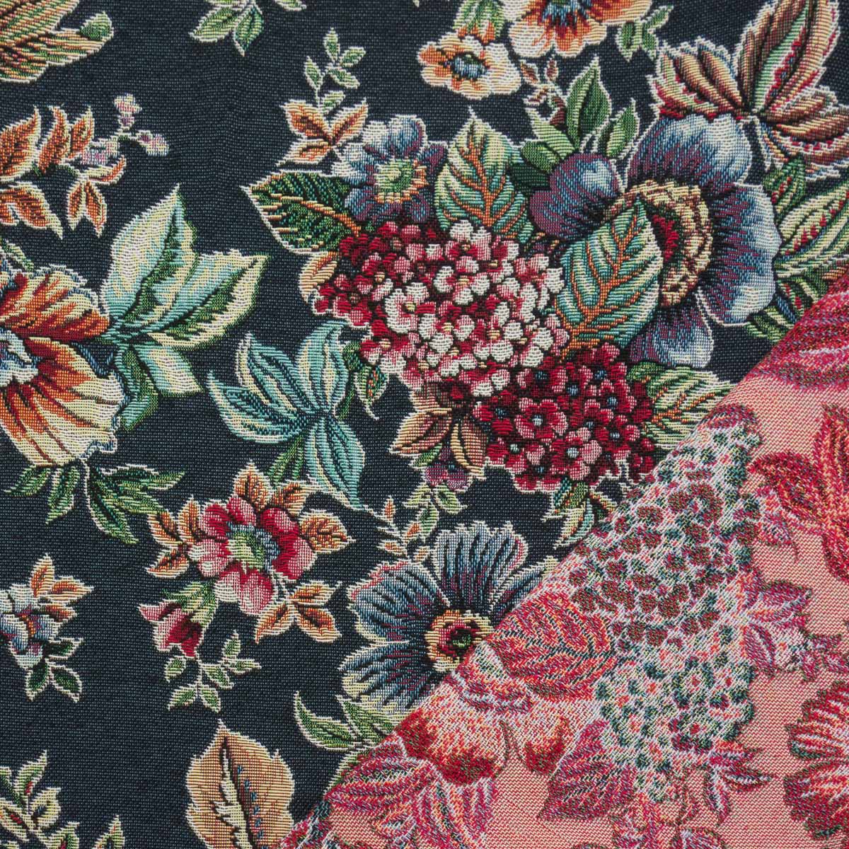 Dekostoff, Gobelin, schwarz, rottöne, grüntöne, florale Motive