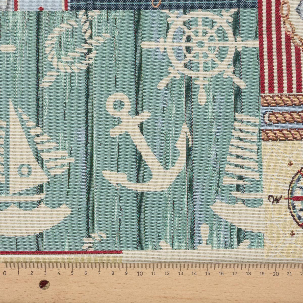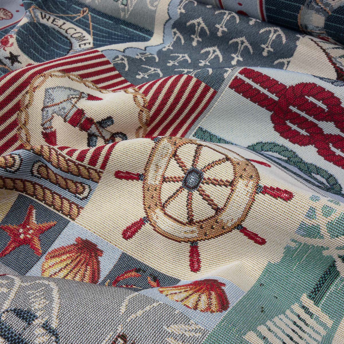Robuster Gobelin in Patchwork-Optik, mit eingewebten, maritimen Motiven wie Anker, Kompass und Rettungsring. Geeignet z.B. für leichte Polsterarbeiten, Wohnaccessoires und Taschen.