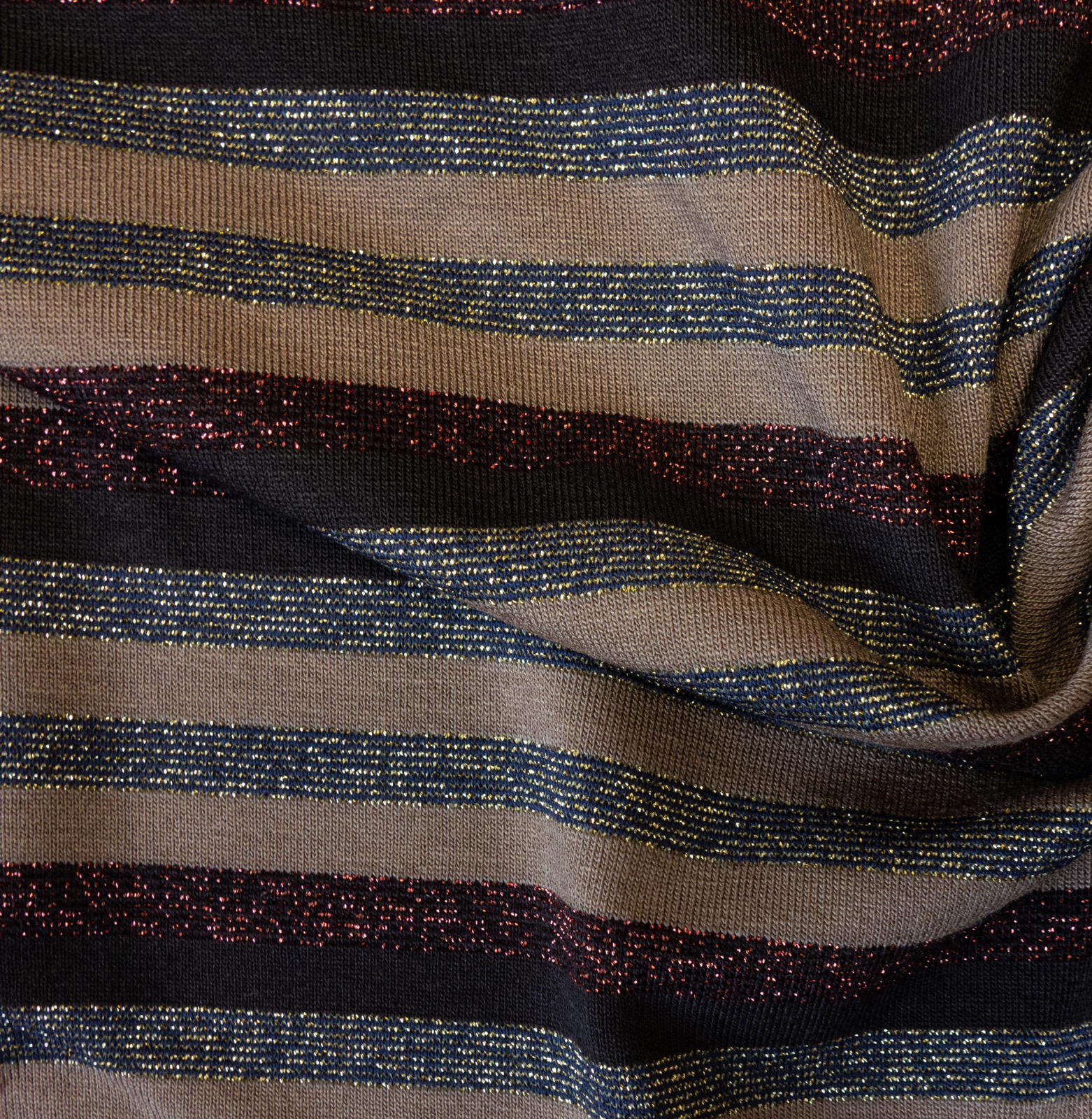 Leichte und elastische Maschenware mit Querstreifen in dunkelbeige mit goldenen und roten Glanzfäden. Geeignet z.B. für Tops und Kleider.