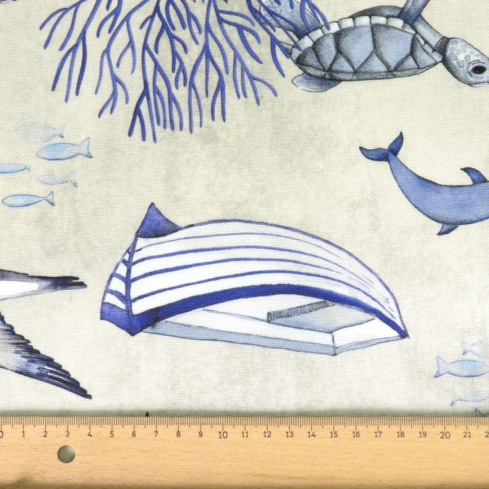 Robuster und lichtbeständiger Stoff für den Außenbereich aus wasser- und schmutzabweisenden Fasern mit mittlerem Stand bedruckt mit Boten, Ankern, Rettungsringen, Delfinen, Möwen und Schildkröten. Geeignet z.B. für Sonnenliegen, Strandkörbe, Markisen, Sonnenschirme, Sonnensegel, Outdoorkissen und Taschen.