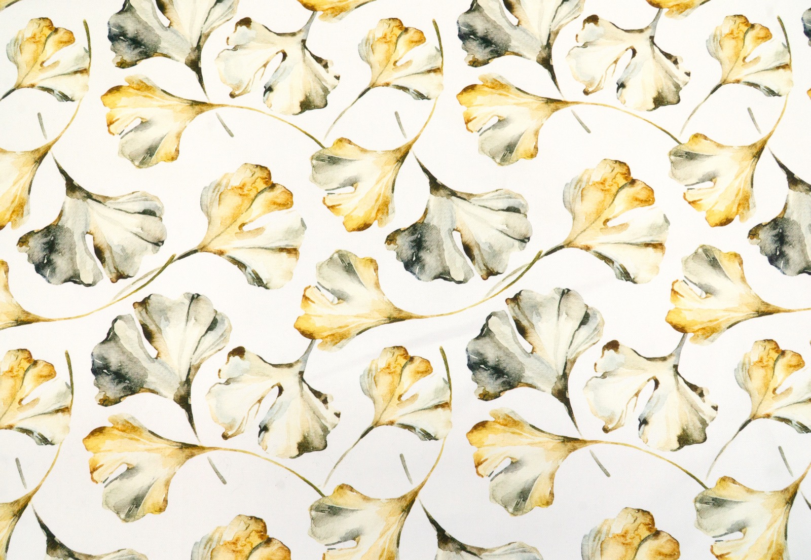 Dekostoff aus Baumwolle bedruckt mit Ginkgoblättern. Geeignet z.B. für Vorhänge, Taschen und Kissen.