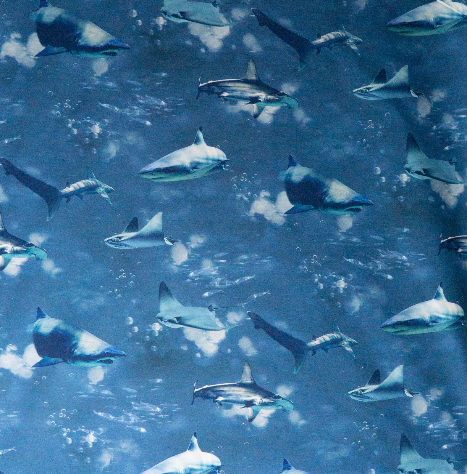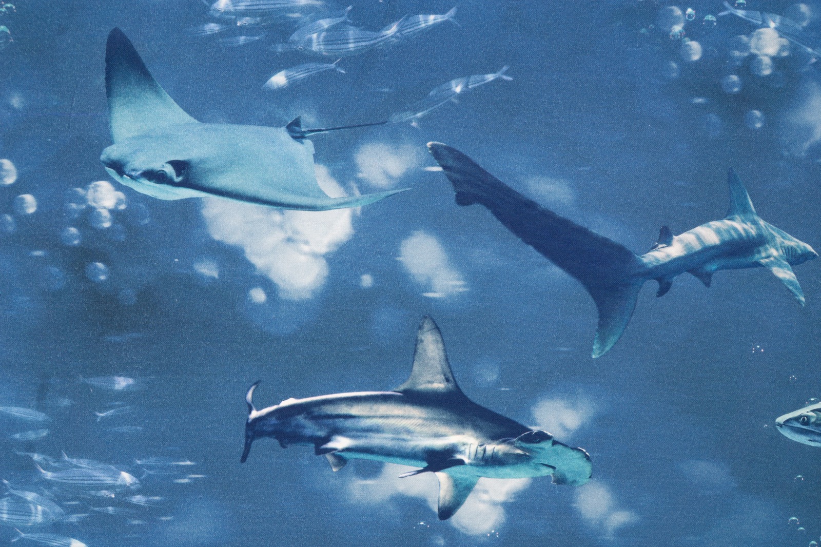 Dekostoff aus reiner Baumwolle mit einem fotorealistischem Druck aus verschiednen Hai- und Fischarten. Geeignet z.B. für Kissen, Vorhänge und Taschen.