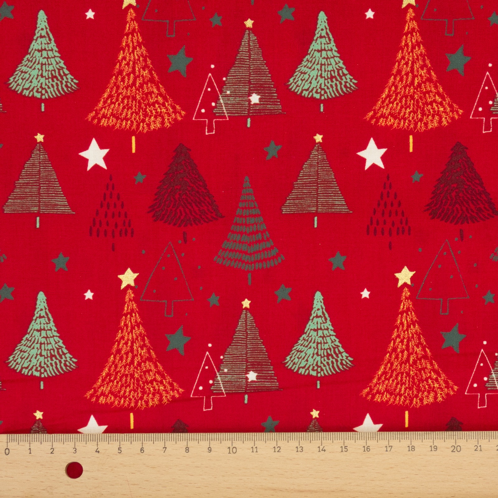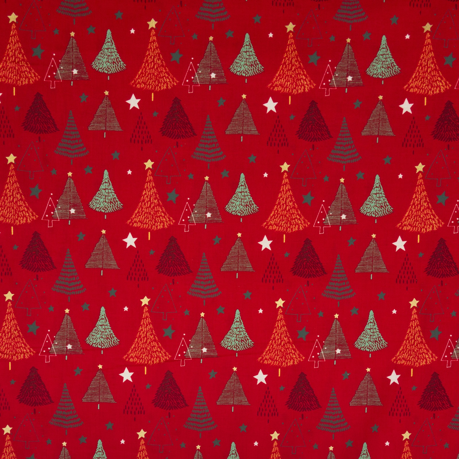 Feines Baumwollgewebe bedruckt mit teilweise gold schimmernden, weihnachtlichen Motiven. Geeignet z.B. für Wohnaccessoires, Dekoration und wiederverwendbare Geschenkverpackungen.