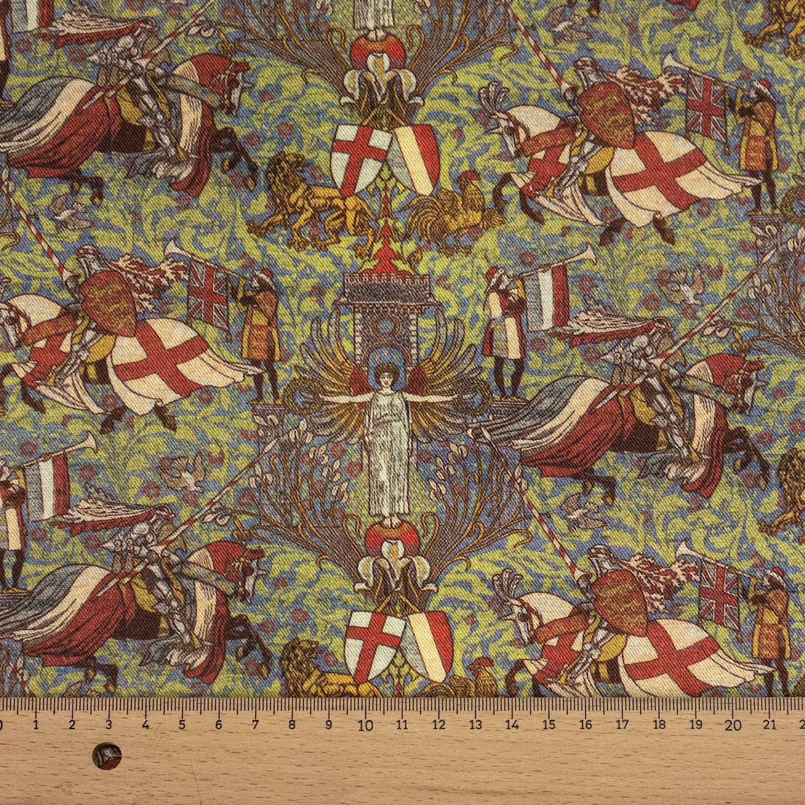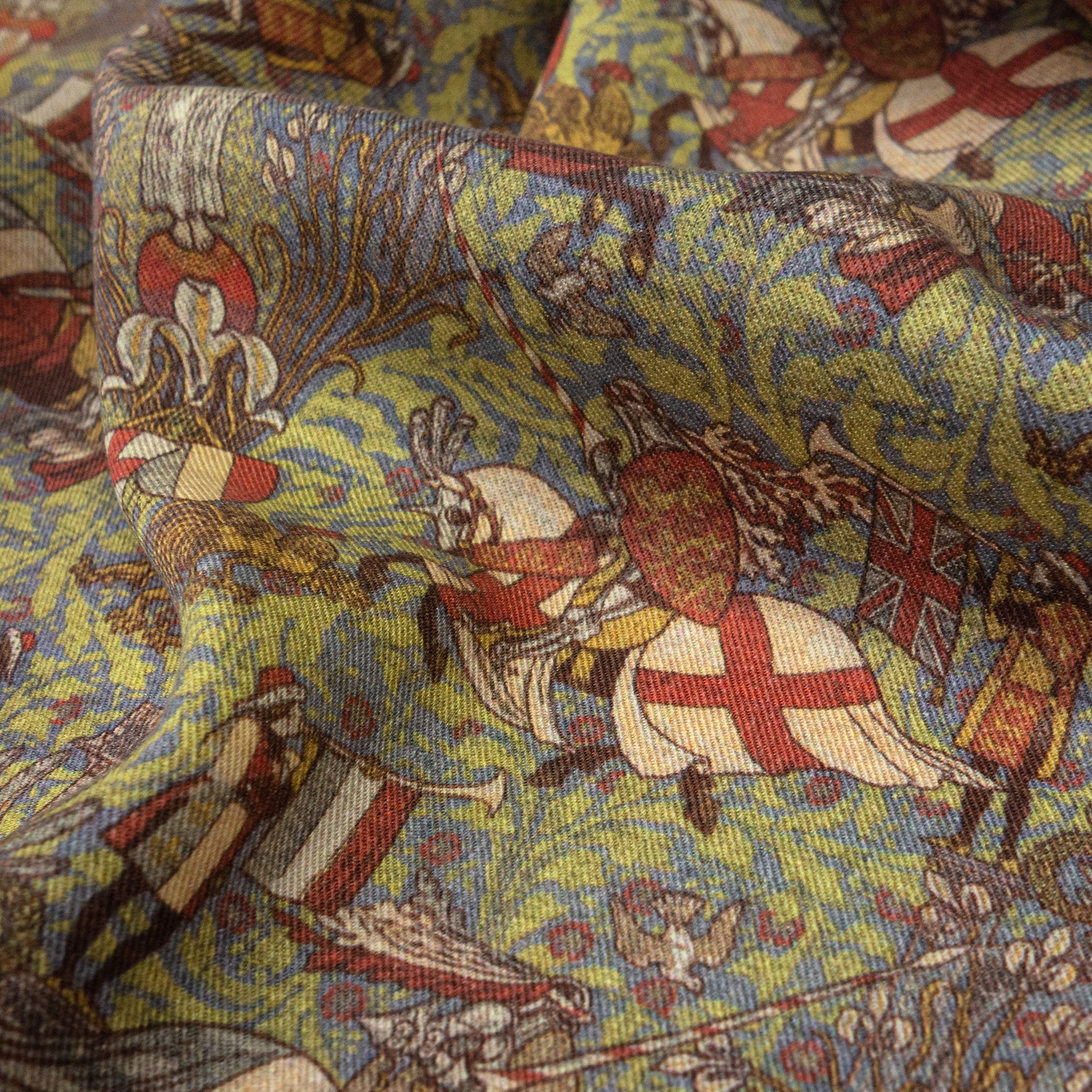 Fließendes und sehr weiches Gewebe aus reiner Lyocellfaser bedruckt mit mittelalterlichen Rittern und Engeln. Geeignet z.B. für außergweöhnliche Hemden und Blusen.
