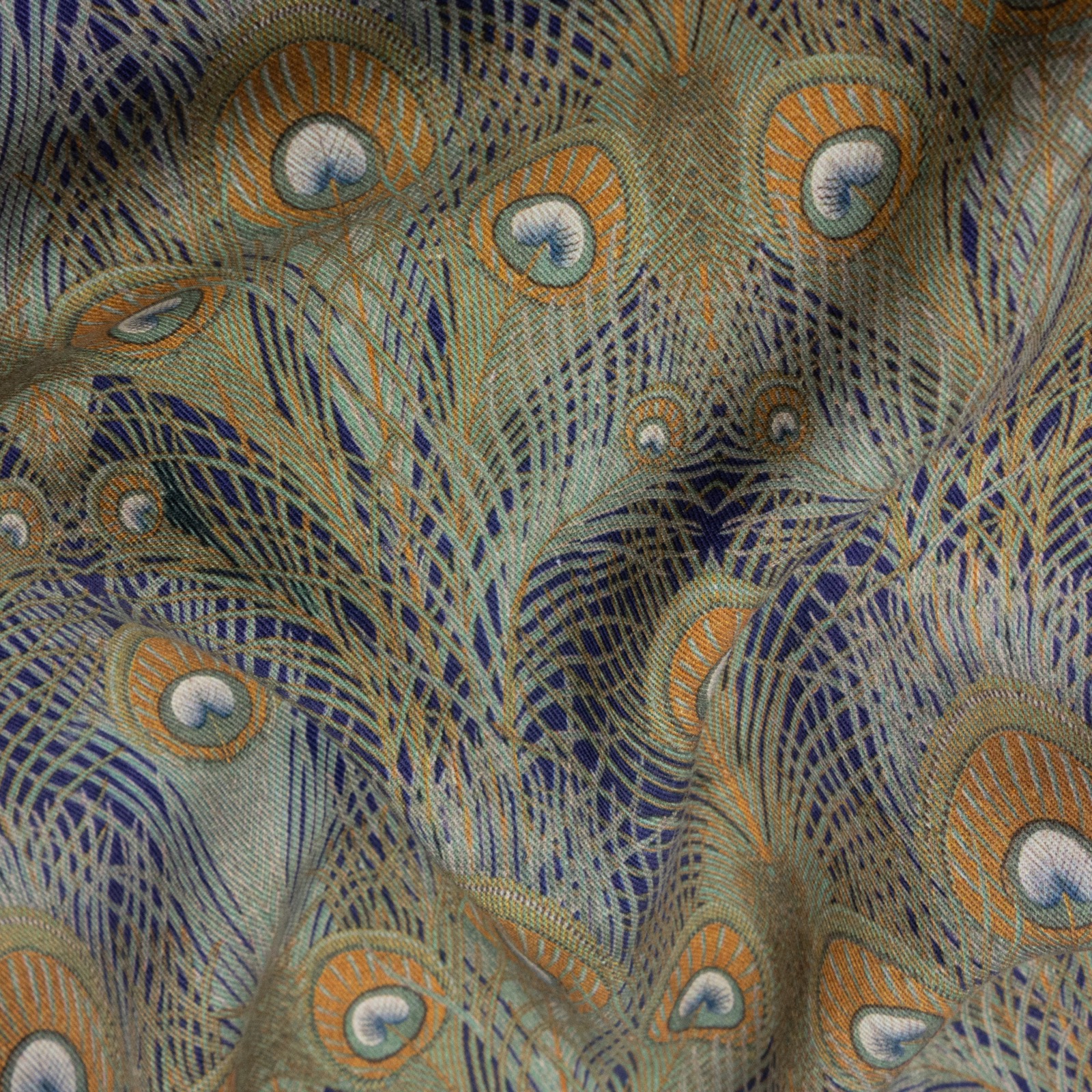 Fließendes und sehr weiches Gewebe aus reiner Lyocellfaser bedruckt mit grafisch angelegten Motiven aus Pfauen-Federn. Geeignet z.B. für außergewöhnliche Hemden und Blusen.