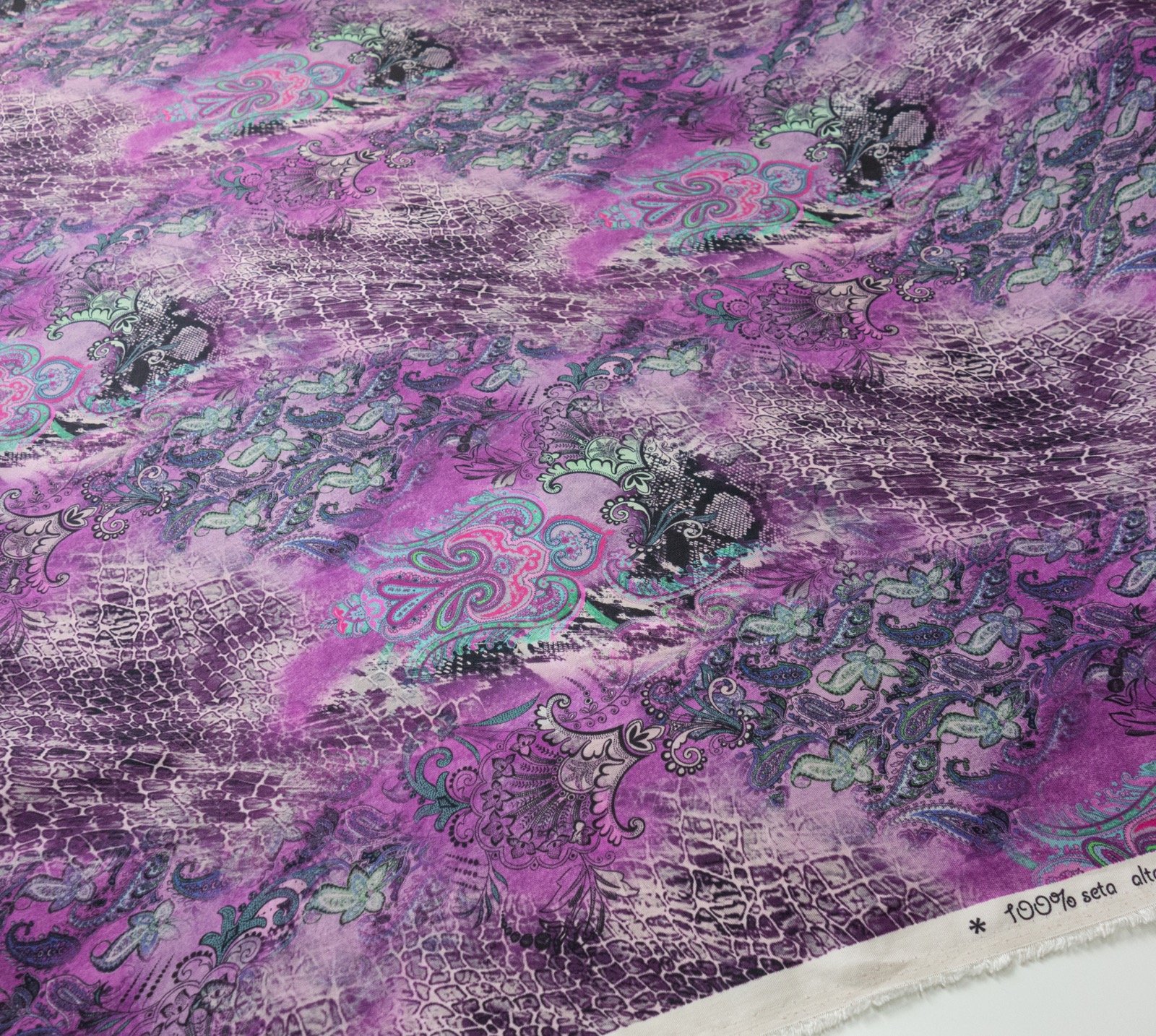 Leichtes und feines Gewebe aus reiner Seide bedruckt mit Paisley Elementen und Schlangenhaut Muster. Geeignet z.B. für außergewöhnliche Kleider, Blusen und Tücher.