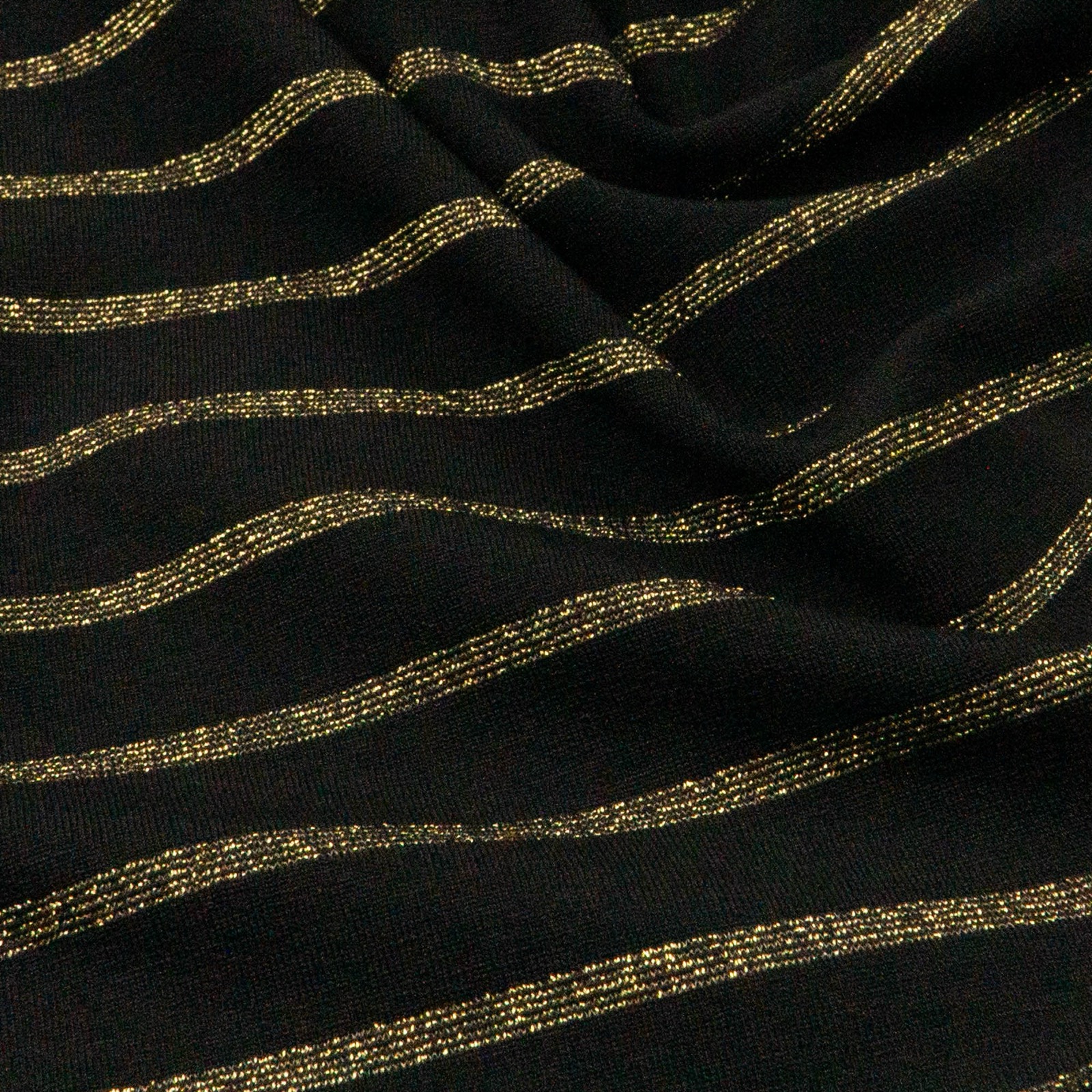 Elastischer Viskosejersey mit goldglänzenden Streifenmuster. Geeignet z.B. für Shirts, Longsleeves und Kleider.