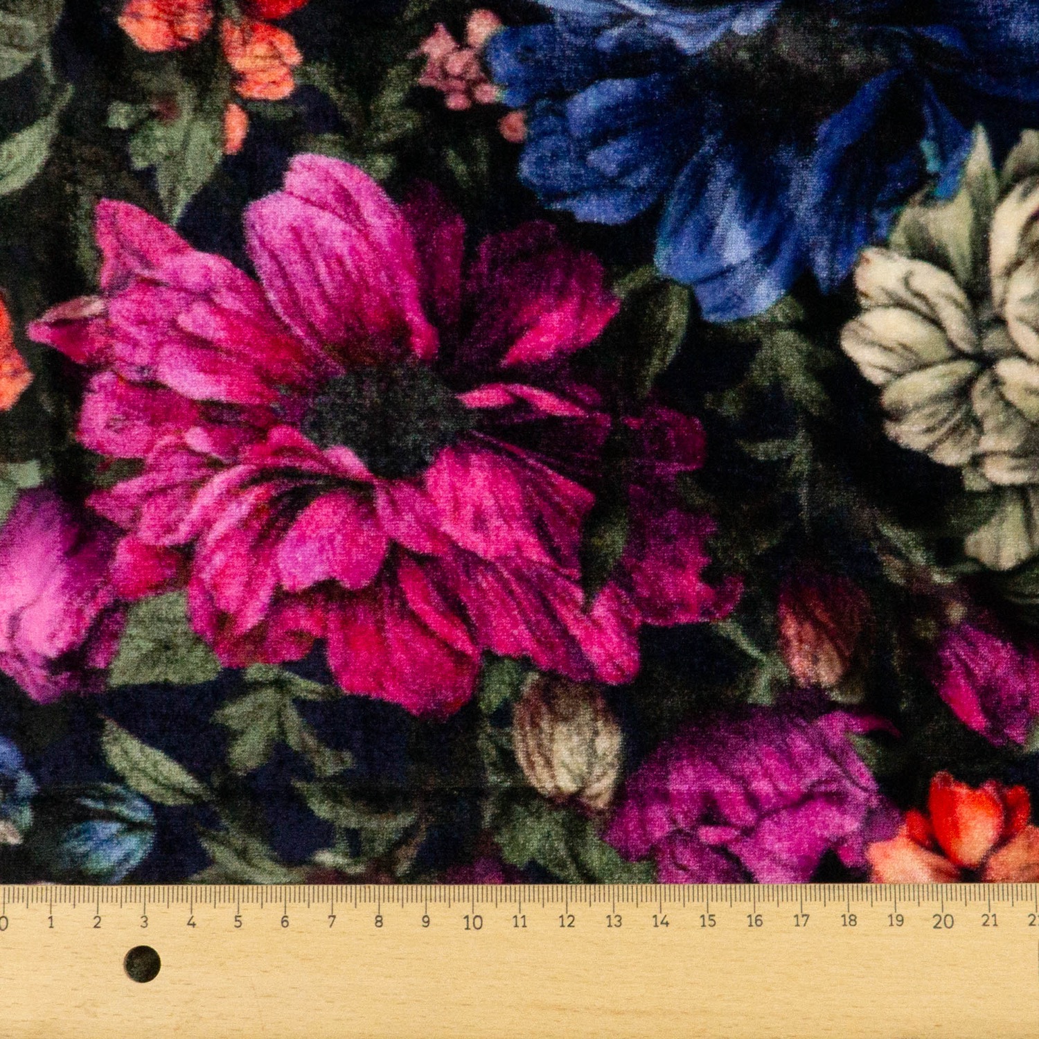 Viskosestoff, Samtstoff, schwarz, pink, blau, florale Motive